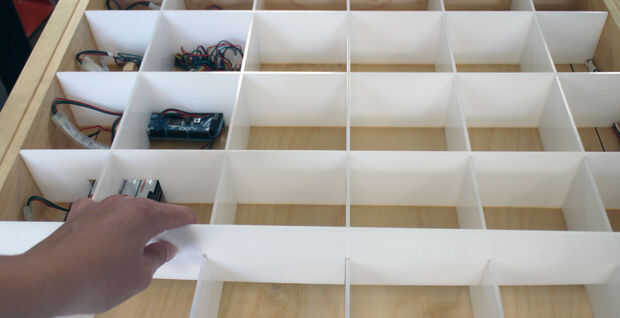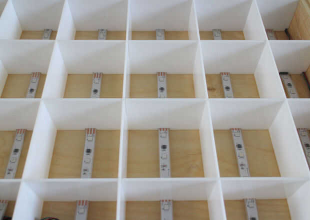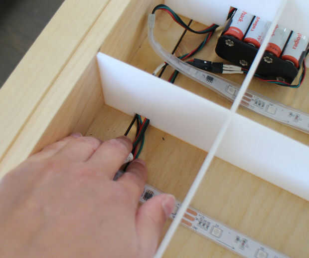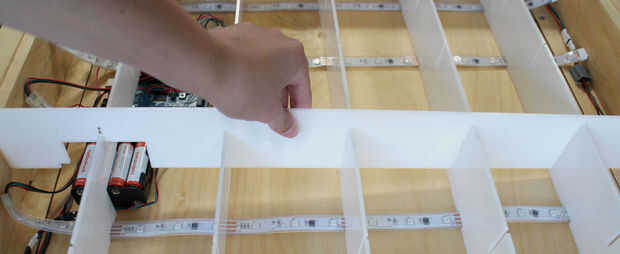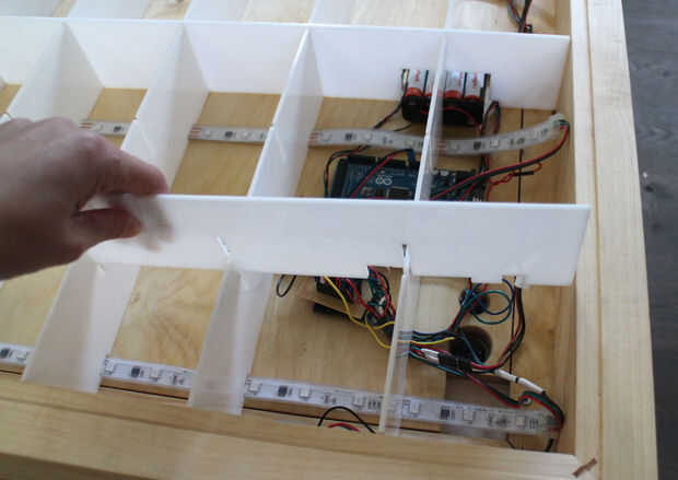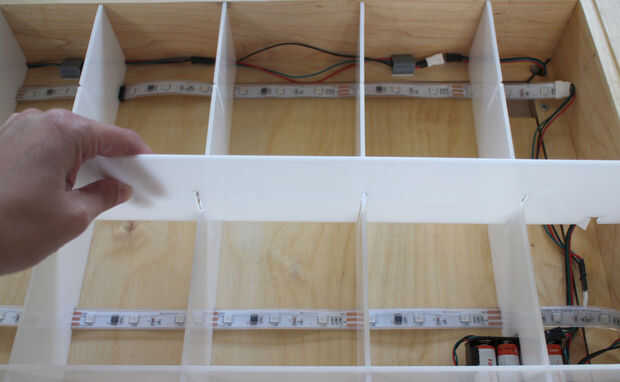 Mi mesa no era perfecto, así que algunos de los divisores no encajaban dentro del marco superior. Yo con cuidado lijarles hasta que lo hicieron, verificar el ajuste cuando fui. Luego montar la estructura del divisor y ponerlo en su lugar dentro de la tabla. Una vez que fue sobre todo en su lugar, había cambiado los cables y tiras de LED por lo que ponen en las muescas y no atrapada entre los divisores y la bandeja de electrónica.