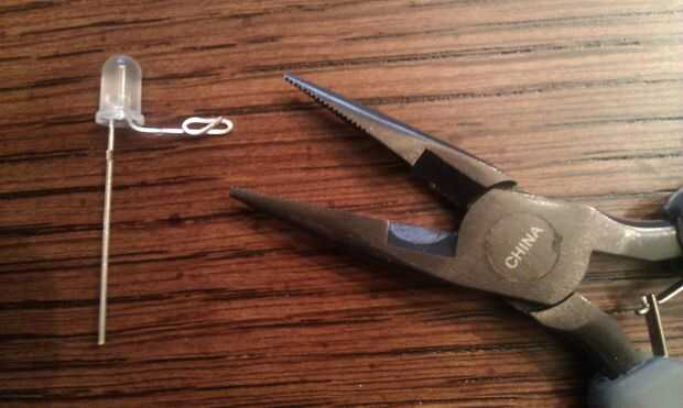 Comience doblando la pata negativa del LED (este es el más corto) para que se sienta en un ángulo de 90 grados contra la otra pierna (positivo). Luego, usando unas pinzas de punta de aguja, enrollamiento final en forma de espiral.