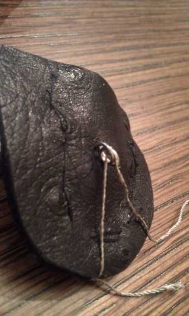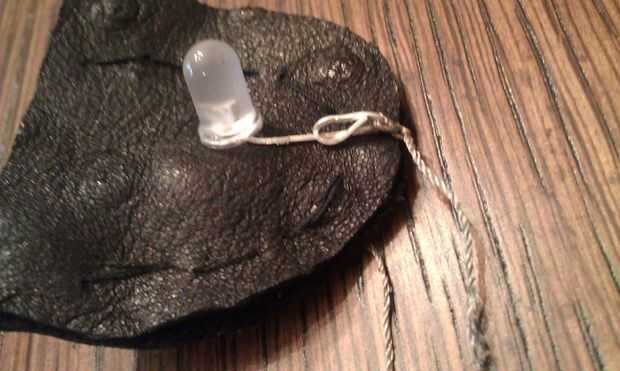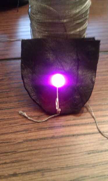 Uno rotula de su hilo conductor en el bucle que creó con la pata negativa de su LED. Tirando del hilo tenso, envuelva en la bolsa y atar el otro extremo con el bucle que hiciste con el headpin. Esto debería hacer que el LED enciende para arriba!