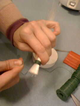 Comience con un manojo de hilos de fibra óptica--sobre el diámetro de un centavo. Cortar el manojo entero de una hasta 20 pulgadas, asegurándose de que los cables están todos al ras en la parte inferior. Luego, envolver los hilos con cinta aislante 1/2 pulgadas de un extremo a mantener en su lugar. Por último, muy bien viento alambre floral sobre la cinta aislante varias veces para asegurar. Prueba para asegurarse de que los filamentos no caer - si ellos, apriete el cable. Si es necesario, cortar todos los extremos de la fibra óptica a lo largo de la parte inferior para garantizar incluso.