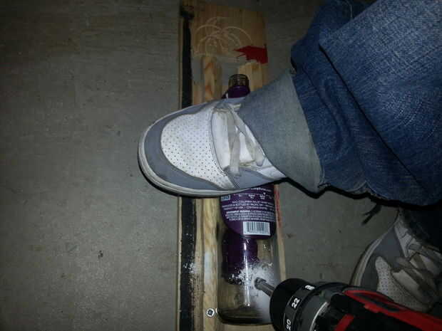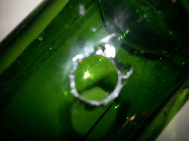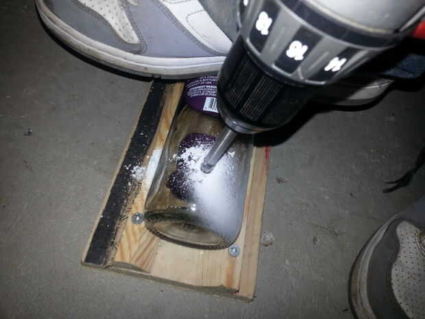 Ahora su orificio en la parte inferior de la botella en la parte posterior. Esto es donde se deslizarán las luces. Usé un pedacito de taladro de cristal media pulgada. Usé mi pie presionado la botella a la plantilla. Asegúrese de que a donde los zapatos. También cuando cortar vidrio deben usar gafas o anteojos de cristal causa puede arrojar alrededor de. Marca su punto y comienzo de perforación van lentamente tome su tiempo y agregar lentamente la presión. Practico en una botella de vino repuesta rompo una botella haciendo estos.