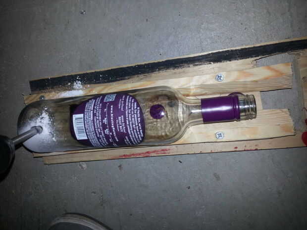 Hacer una plantilla ayuda a mantener la botella de vino de la mudanza cuando se taladre el agujero. Usted sólo podría apuntalar la botella en el borde de dos piezas de madera pero hice la plantilla. Para hacer la plantilla la base de la longitud de la botella de vino y el ancho 7 pulgadas el el tamaño de la Junta que tenía. Entonces usted tendrá que cortar dos tiras de madera para atornillar a la parte de base. La clave de esto es que hay que hacer un ángulo de 45 grados en el interior de ellos. La forma más fácil de hacer estos es tomando una circular y mover el marcador de 45 grados. Corte la tira sobre una pulgada o dos de ancho y cortar la tira. Corte dos veces tan largo como la botella de vino para que se puede utilizar para ambos lados de la plantilla. Esto también podría hacerse con una sierra de mano y velocidad maring cuadrado el ángulo y el corte a lo largo de él. Luego atornille estas tiras para que la base del ancho de la botella de vino. Me mantiene presionado y la botella de vino en él así que no se movía. Quita la botella de vino y se atornilla abajo las tiras en ese punto.