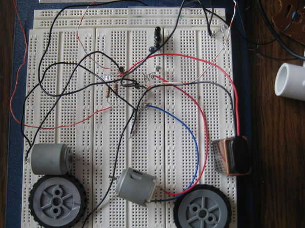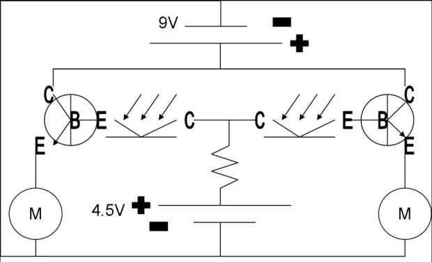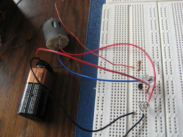 El valor de la resistencia puede determinarse observando las especificaciones técnicas de los transistores, fototransistores y motores. Compré los dos primeros componentes de RadioShack y los motores eran sólo recambios, así que no tuve especificaciones. Experimenté con diferentes resistencias hasta que logré una velocidad del motor que me ha gustado, colocar en un 5k.