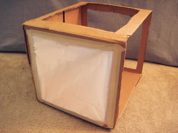 Corte un pedazo de papel de tejido de tamaño correctamente por el orificio. Cinta de los bordes hacia abajo en el exterior de la caja.