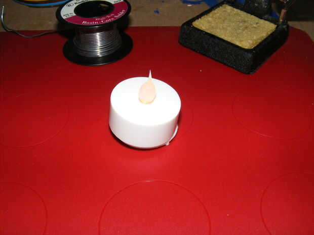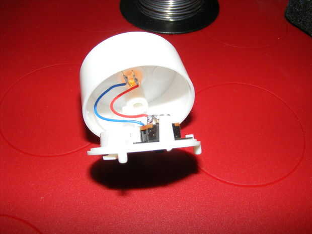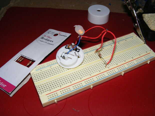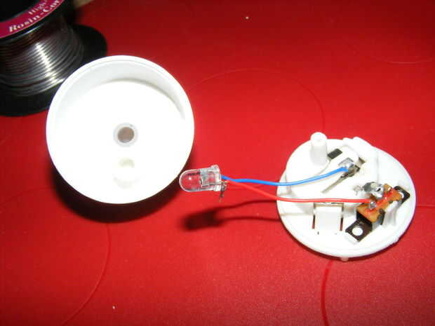 El siguiente paso fue soldar la resistencia en el circuito. Había corté un trozo de cable de conexión para que extendería el LED encima de y lejos de la base. Sustituir a uno de los cables con el nuevo cable y soldadura.
