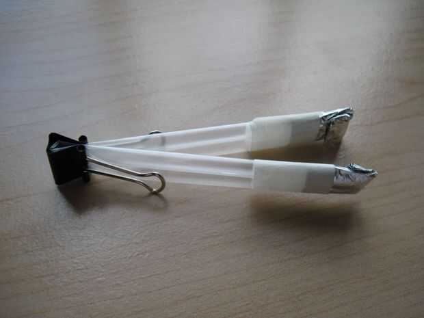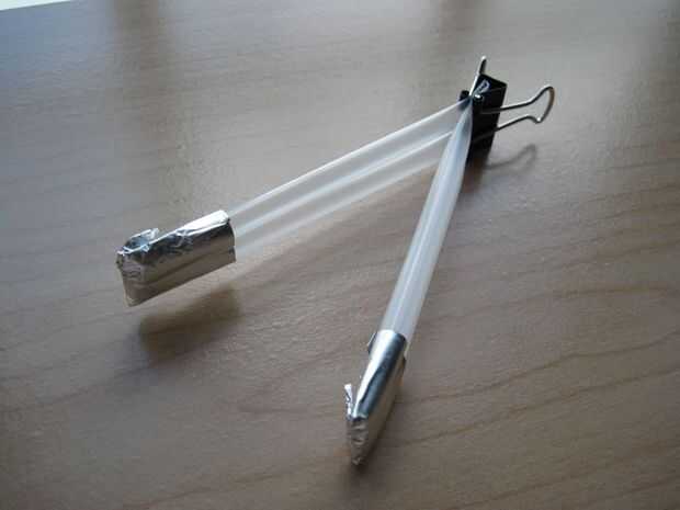 Ahora, vamos a añadir el papel de aluminio a los contactos por rasgado por la mitad, enrollándola alrededor de la paja un poco y grabar abajo. Óptimo, sería doblar el aluminio hacia adentro para aumentar la superficie y así mejorar los contactos del interruptor.