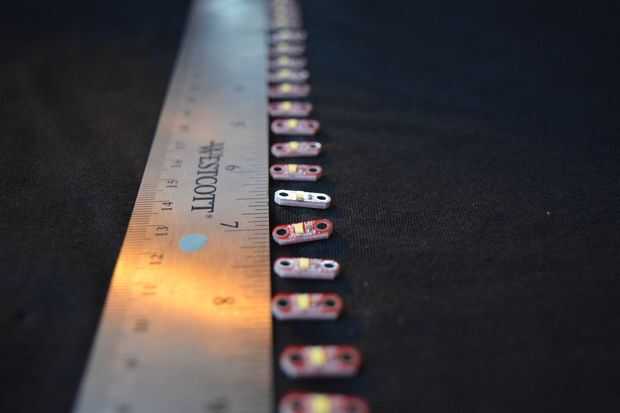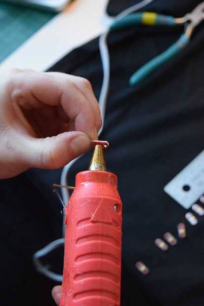 Contorno donde desee su hardware con tiza, poner el hardware donde quieren y fije con un poco de pegamento caliente. Cuando alineando los indicadores LED, asegúrese de que los aspectos positivos y negativos son en línea. También considere donde las líneas van al colocar tus LEDs. Pongo estos LEDs 1/2 una pulgada de distancia.