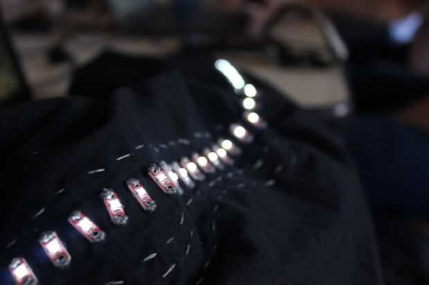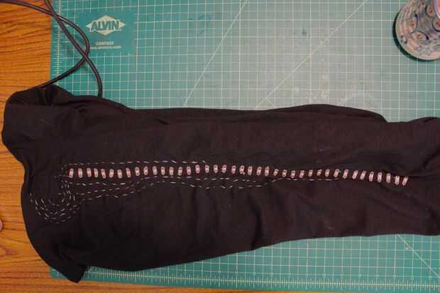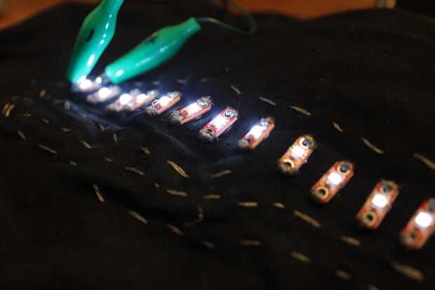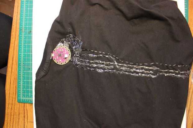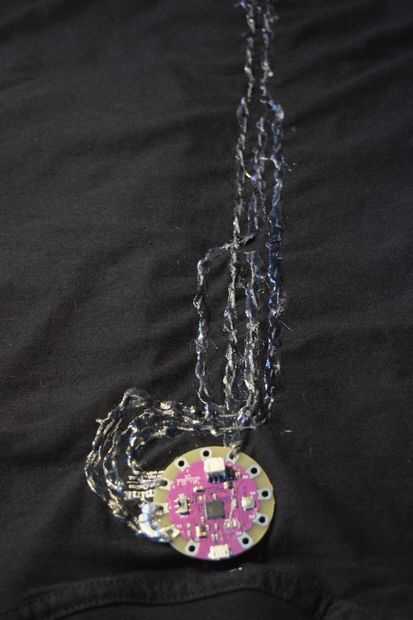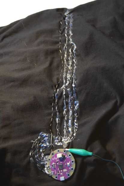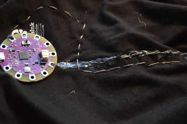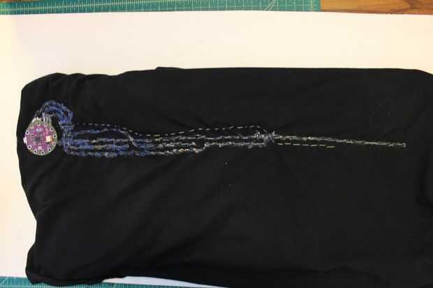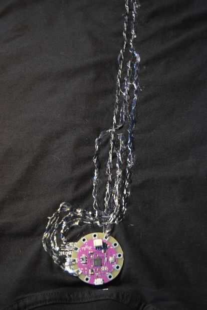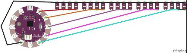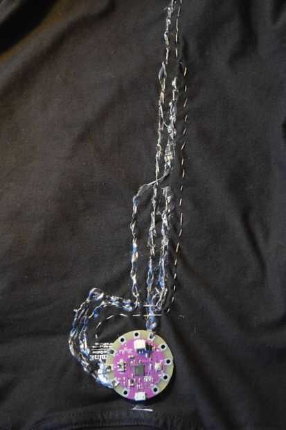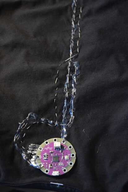 Utilizar la misma técnica para coser en la línea positiva, como lo hizo con la línea negativa, pero seguir el diagrama. El diagrama sólo tiene 4 LED por el pin (orificio en el LilyPad), pero la versión física tiene 8 LED por el pin.