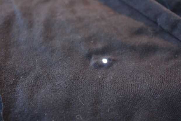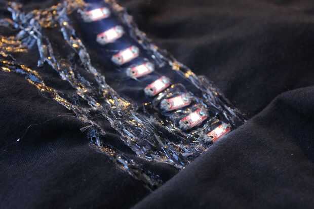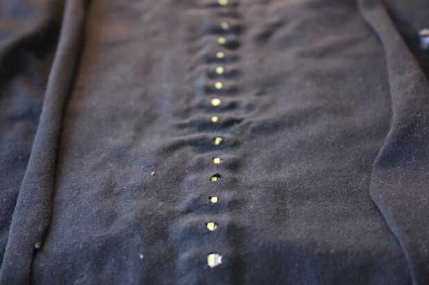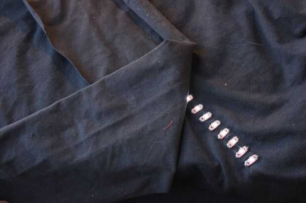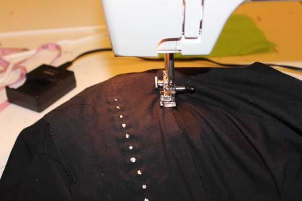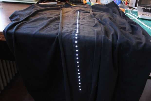 Para cubrir los LEDS, pegamento caliente una tira de tela sobre los LEDs. Tenga cuidado de no cubrir el LED en la cola. Utilizar tijeras de tela para cortar pequeños agujeros sobre el LED. Yo prefiero pegar a la tela hacia abajo y luego cortar todos los agujeros. Si desea, luego puede coser por los lados de la tira de tela a encolar. Me gusta cómo esta había terminado el borde, pero no es necesario.
