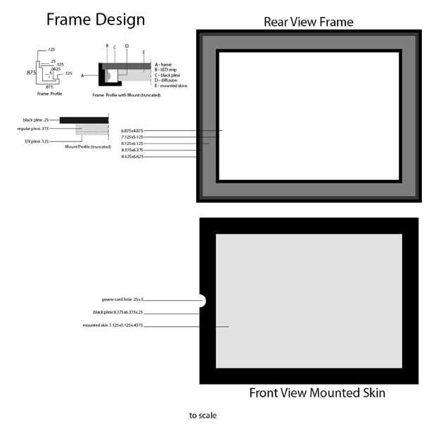 El objetivo del diseño es proporcionar una luz relativamente incluso todo el camino alrededor del objeto manteniendo un perfil de marco pequeño. Para ello una cavidad se crea entre la pared de la estructura y se coloca el bloque de acrílico que se ilumina y una capa de difusión. Varias superficies y bordes también fueron construidos en el marco de mantener todo en su lugar. Mirando la imagen de diseño de marco puede ver estos espacios y repisas. Estos son dimensionados de modo tal que mantenga todo apretado y Ras uno con el otro, ayudando a evitar que la luz se filtra y proporcionar una satisfacción terminado objeto libre de vibraciones y con una sensación sólida, profesional.