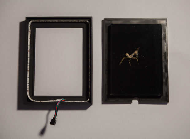 3) el arte y el respaldo de la preparación. Si no tienes el plexi de respaldo por una tienda de corte ahora y perforar una parte del centro de la parte inferior el borde para permitir que el cable salir de la parte posterior del marco. Montar las dos piezas juntas. La parte posterior del arte de la pintura su color de elección y luego adherirse al plexi de respaldo en lugar de intentar pegar recto.