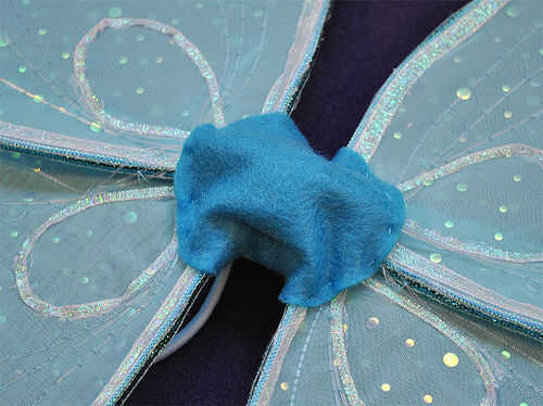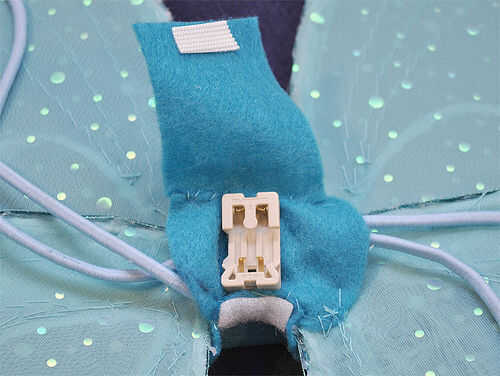 En la parte posterior de las alas, coser un rectángulo de fieltro en un borde del círculo, haciendo un colgajo. Esto cubre la batería y añadir un pequeño acolchado en la parte posterior de las alas para que no sientas el portapilas hurgando en la espalda mientras se está usando. Añadir velcro en el extremo para que sea fácil de acceder a la batería.