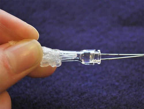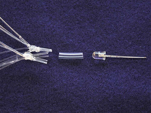 Corte un pedazo pequeño (3/4") de la tubería plástica original de que tiró de la fibra óptica y coge uno de tus LEDs. Empuje con cuidado los extremos de fibra óptica en el tubo y luego el LED en el otro extremo, conseguir tan juntos como sea posible. Asegúrese de que la pierna más larga del LED es hacia la parte superior. Si el LED no cabe, corte una pequeña ranura en el extremo del tubo para darle más espacio. Pegamento caliente todo junto una vez que esté en su lugar.