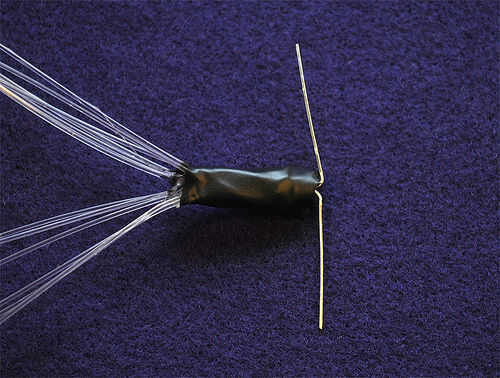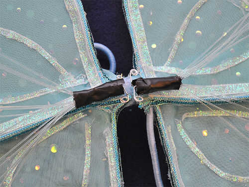 Coloque sus paquetes de fibra óptica/LED en el centro de la parte delantera de sus alas con las patas positivas hacia arriba.