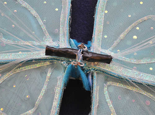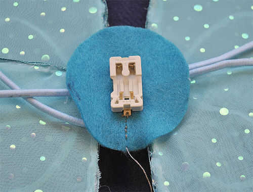 Usando el hilo conductor, enrolle el hilo a través de las lengüetas de metal un par de veces y cosa una línea en el fieltro. Voltee las alas y coser los lazos de tu LED, asegurando que el fieltro y asegurándose de hacer una buena conexión. Me gusta ciclar aproximadamente 3 veces más que creo que es necesario.