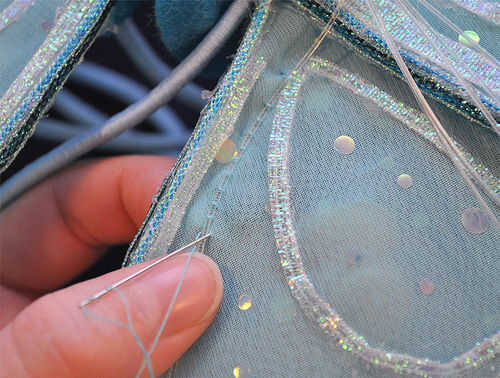 Retire la batería después de probar y coser su fibra óptica en su lugar, utilizando el patrón que usted diseñó anteriormente. Use hilo de algodón en un color (o monofilamento) coordinación coser los hilos en tus alas.