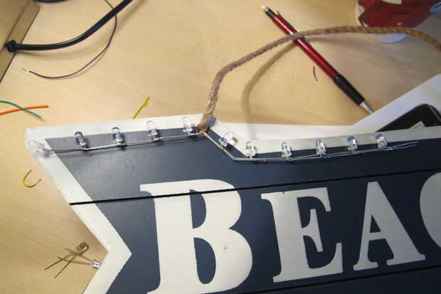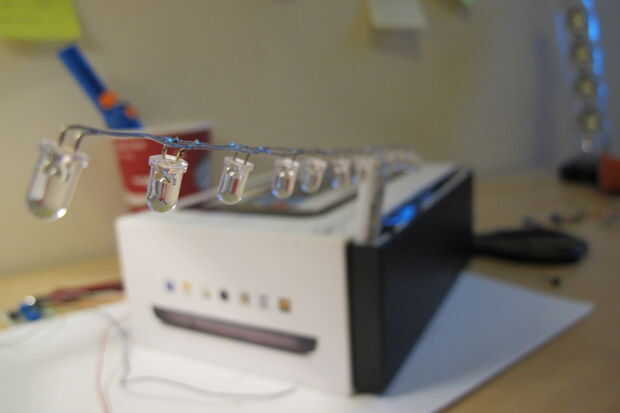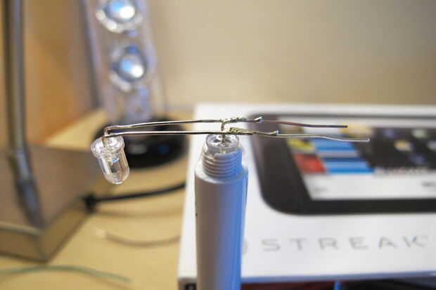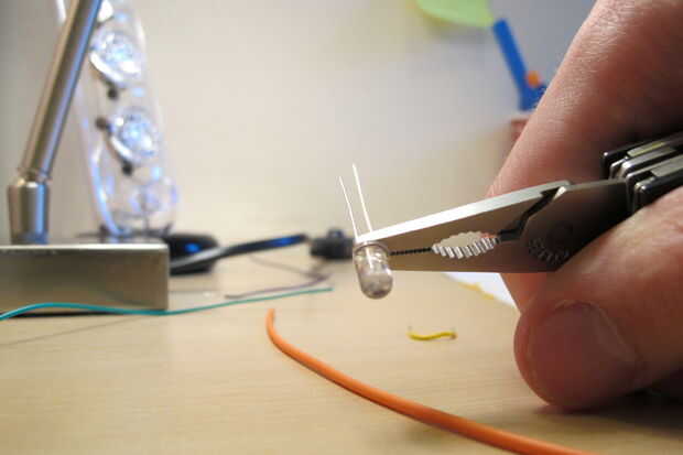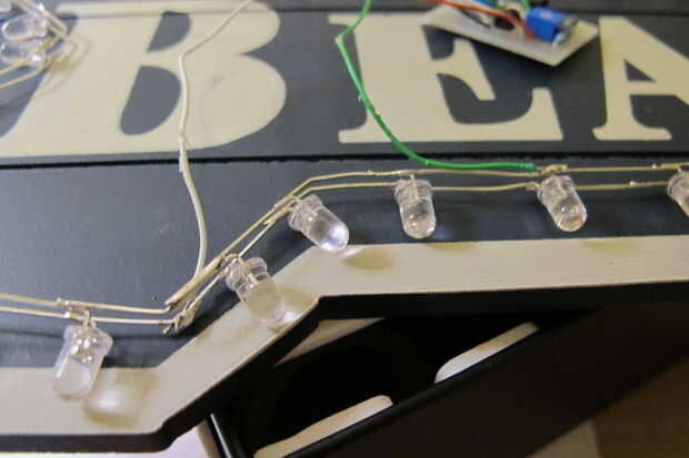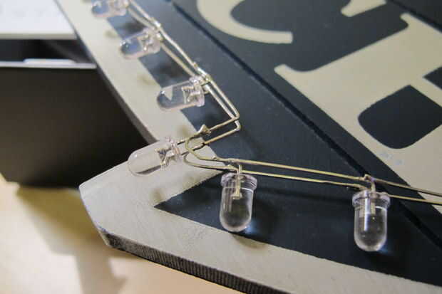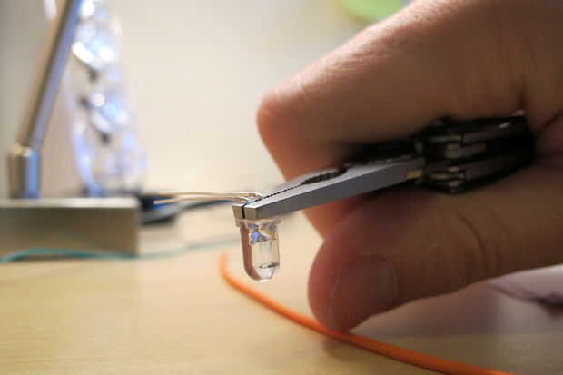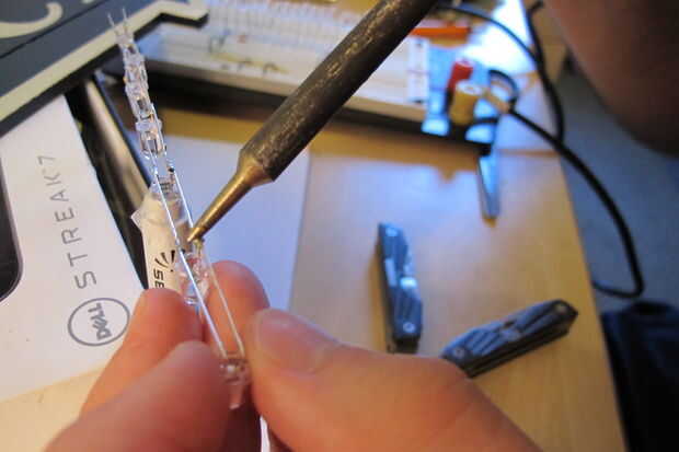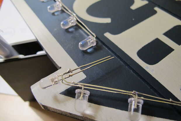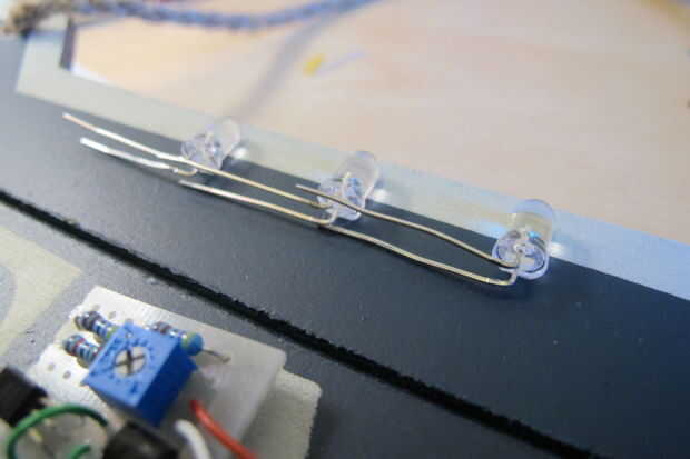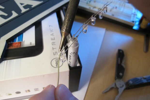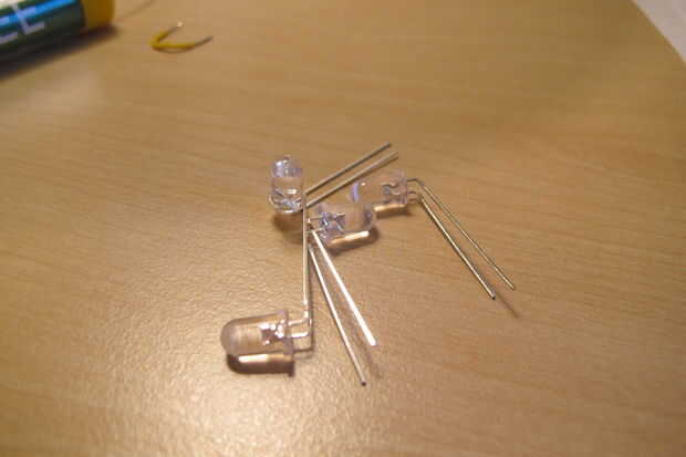 En su lugar decidí doblar las patas de los LEDs y soldar cada uno a la anterior en una línea. Así son todos los LEDs en paralelo y si uno se quema el resto funcionará! Además de eso usted necesita sólo 1, 5V para alimentarlos.