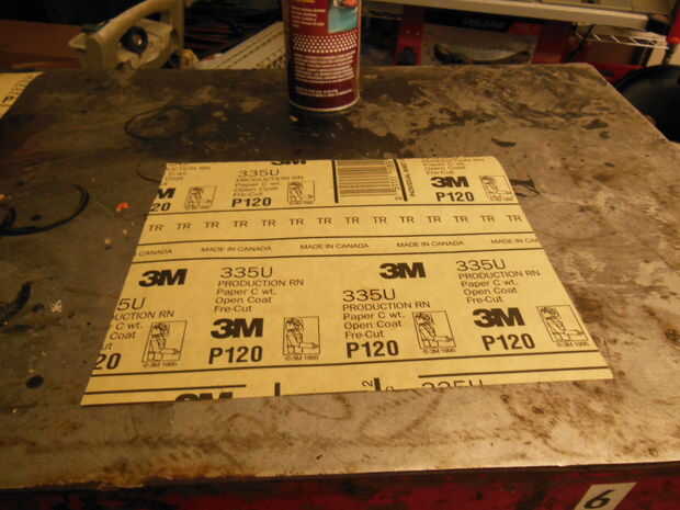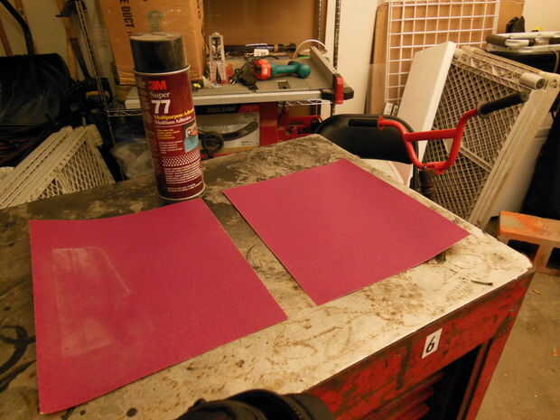 En un lugar bien ventilado, sobre una superficie durable, ponga su lija lado arena hacia abajo. Rocíe generosamente con adhesivo en aerosol, asegurándose de que mantenga la boquilla por lo menos 6" de papel. Después de que termines de rociadura, recuerden inclinar la lata boca abajo y rociar un poco para limpiar la boquilla. Ajustar un temporizador de 9 minutos y búscate una taza de té o café. Este tiempo de espera es permitir que el adhesivo se consigue pegajoso para el siguiente paso.