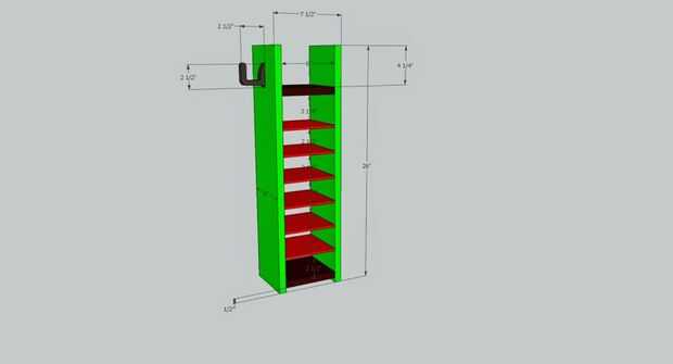 Las dimensiones de la caja fueron 26″ alto por 6 1/2 de ancho y 6 pulgadas de profundo. El estante inferior está montada 1/2" de la parte inferior y el estante superior es de 5 1/2 pulgadas desde la parte superior con todo el espacio entre de los divisores de papel de lija. Espaciados los divisores para el papel de lija sobre cada 2,5 pulgadas o así, puede espacio les sin embargo lejos aparte necesita o quiere.