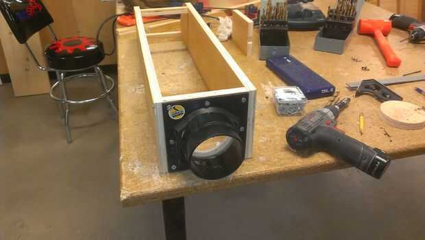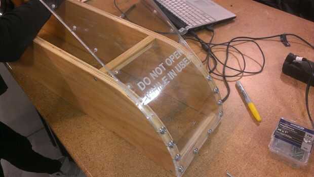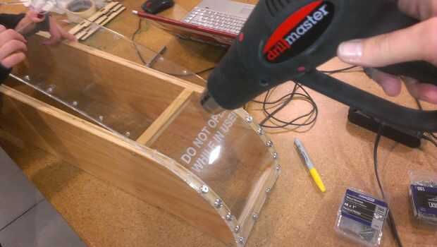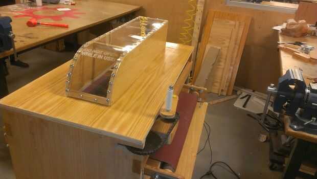 Utiliza láser de acrílico en lugar de listones de madera como se indica en los planes porque pensé que sería genial ver el polvo de lijado volar. También utilicé una pistola de calor para obtener el plástico se curva para el escudo de polvo.