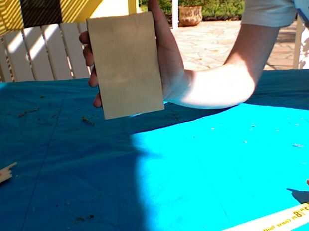 En primer lugar, tomar la pieza de madera y cortar en una forma rectangular tan grande o pequeño como quieras. (el mío es cerca de 4 1/2 X 3 en) Luego, utilizando cualquier objeto plano, corte una sección del papel de lija en la cubierta del patín. Globo ocular justo el tamaño para asegurarse de que cabrá sobre la pieza de madera. Recortar el papel de lija para que quede la madera.