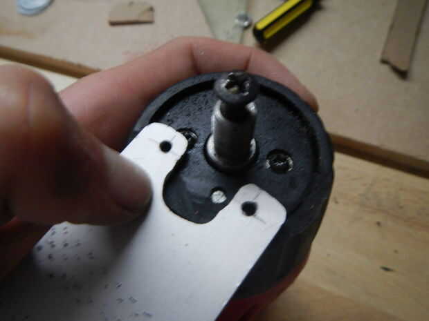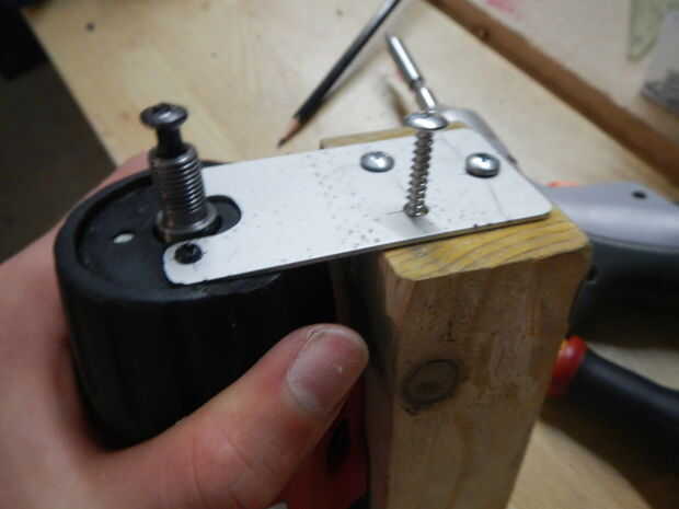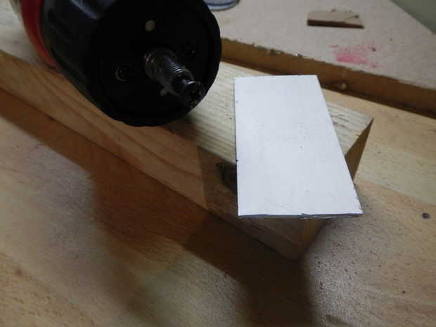 Para levantar el taladro utilizo un pedazo grande de madera. Para fijar el taladro a lo utilizo un pedazo grande de aluminio, cortarlo y tornillo en el extremo de la broca. Luego atornille la pieza de aluminio la pieza de madera con 3 tornillos. I tornillo 2 tornillos a cada lado y colocar un alambre de cobre alrededor de la perforación para evitar cualquier movimiento.