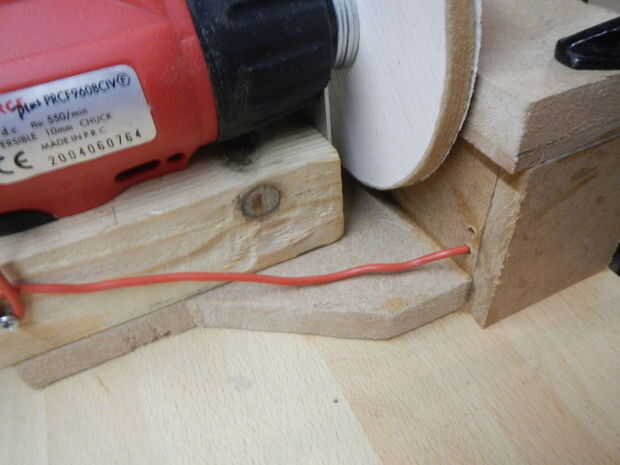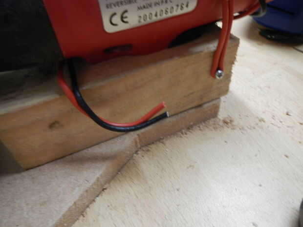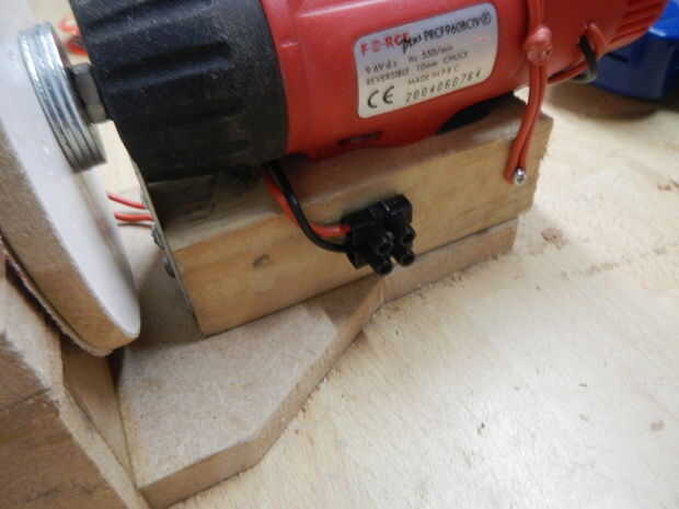 El último paso es conectar el motor con un interruptor. Hacer un agujero para el interruptor en el lado izquierdo del soporte. Conectar a él uno de los cables del motor. Conecte los demás cables del motor y los cables del interruptor al borne de tornillo. Facilita la conexión con una fuente de alimentación. El taladro funciona en 12v y 3 amperios pero la corriente máxima de inicio es de 10 amperios. Tan energía con fuente de alimentación atx. Si desea cambiar la dirección de rotación, de lo contrario la polaridad.