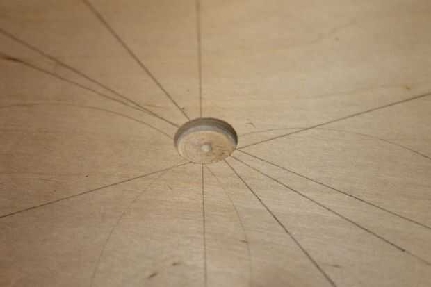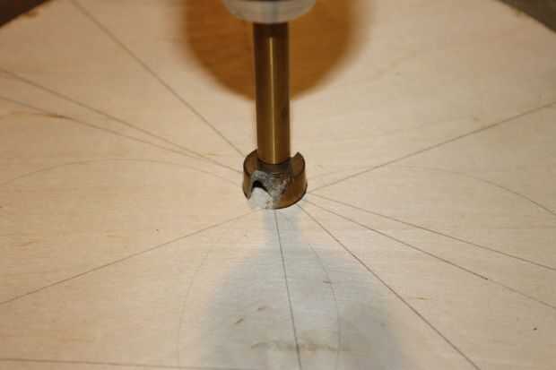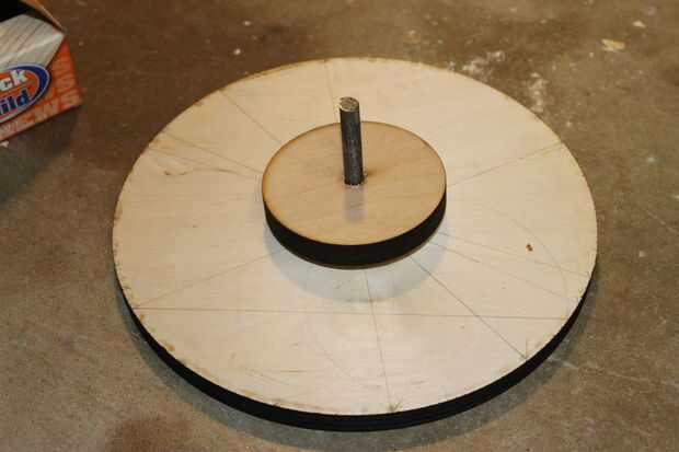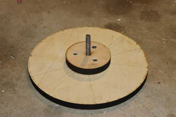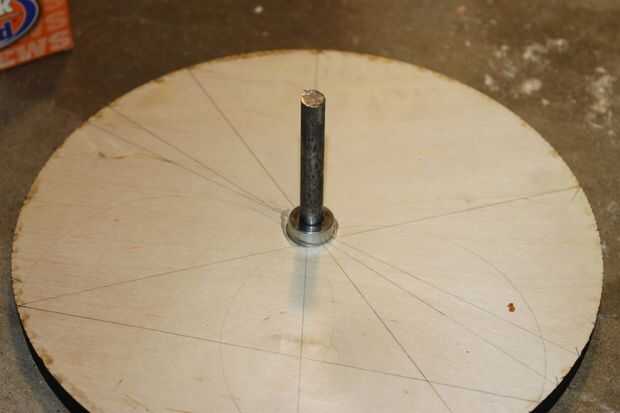 Cortar un segmento de 2 pulgadas de la barra de su 1/4 o 5/16" varilla. Esto puede ser diferente si está utilizando un taladro con un mandril más profundo. Use una broca de tamaño adecuado para hacer una pequeña chuleta para su collar de bloqueo del eje para sentarse en. Yo acabé necesitando un 3/4" pieza Forstner. Esto se puede hacer con un taladro de mano, pero es muy difícil conseguir la profundidad uniforme. Si tienes un taladro de uso. Coloque su segmento de barra en el eje de fijación y bloquearla. Pegamento de ese conjunto en la hierba. Mientras que el pegamento es de secado colocar la pieza circular más pequeño sobre el eje y tornillo a la rueda grande. Usé 3 tornillos. Tomar un cuadrado de ángulo recto y tratar de hacer el eje del stick para arriba en un ángulo de 90 grados. Cuanto más exacta es más fácil el disco equilibrar.