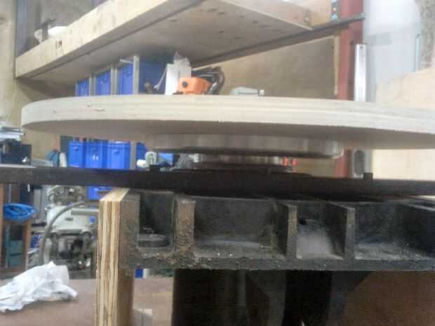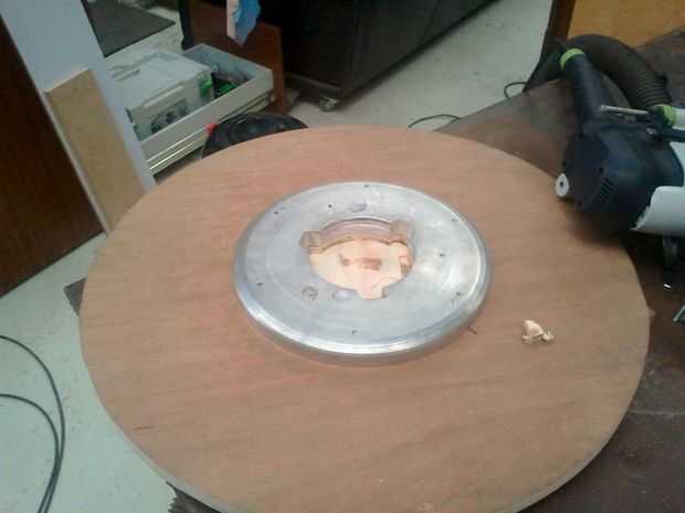 Reflexioné sobre la idea de lanzar un disco de aluminio grande para cubrir el entero 20", pero parecía ambiciosa, y no poder nivelar en el torno. Al final tuve una noche libre en el que quería avanzar sobre la lijadora. Comencé a pensar en hacer el patrón para el bastidor y encontró una plaza de madera que estaba sobre el tamaño correcto.