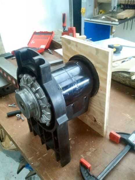 Hice alguna modificación y utiliza el montaje de la vivienda/brida que viene con el motor. Para sentarse el motor horizontal que necesitaba apoyar la parte trasera del motor con algo. Para ello, pegan dos trozos de contrachapado y enruta un círculo en ellos. Siga junto con las notas en las fotos de toda la historia.
