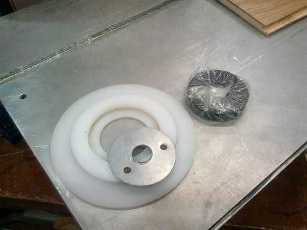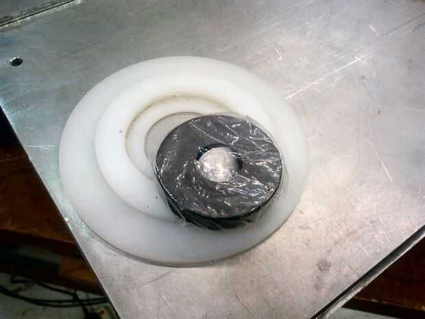 He utilizado un poco trozo redondo de plástico, se me olvida lo que era de (estaba en la caja de discos redondos junto con todos mis trozos de sierra) y pegados algunos forros de metal imán de un microondas viejo a él. Me fijo sólo los forros metálicos, por lo que los imanes se pueden quitar y 'vaciados'.