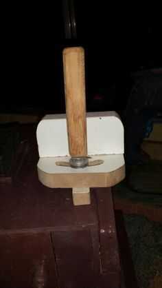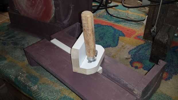 Detalhamento do feito em mdf, goniômetro, e facilita o lixamento em ângulos. O rasgo (o canal) na base possibilita una sua articulação em 45, tanto para direita quanto para esquerda. O cabo de madeira para empurrar o goniômetro possui um parafuso fixa-o no ângulo desejado para o lixamento.