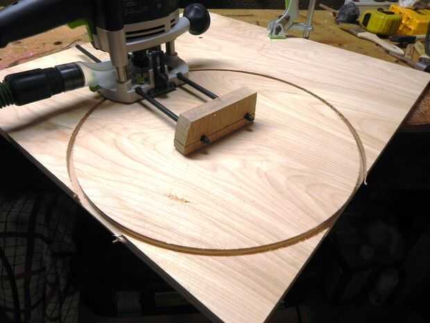 Para cortar círculos perfectos, perforé un orificio guía de 3/8" en el centro del círculo como un pivote. Instalé un alfiler en la valla de mi router y funcionó alrededor en un círculo con un ¼" recta de bits. Si usted no quiere intentar esto, una brújula y una sierra de cinta funciona así. Tenga a mano su desecho, que usaremos más adelante.
