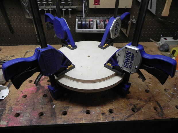 Una vez que dos círculos, poner un taco corto 3/8" a través del orificio piloto para alineación y pegar los discos juntos en una pila. Deja secar durante la noche y montarlo en la placa frontal más grande que se ajuste. Poner en el torno y recortar los bordes con una espátula si es necesario para que se ejecute sin problemas.