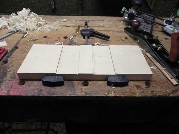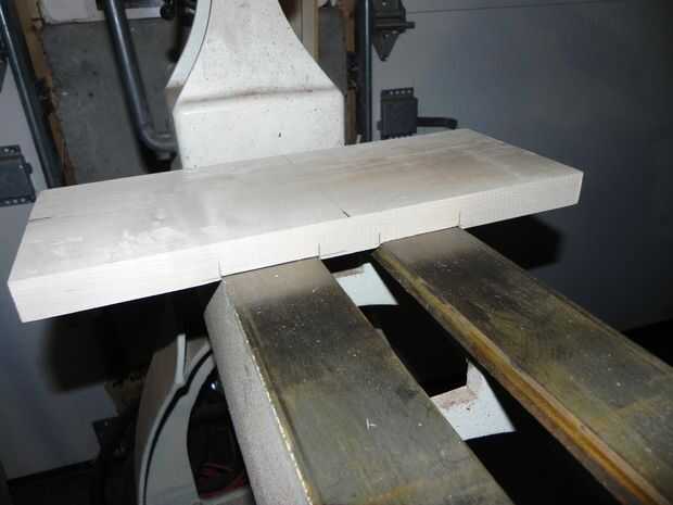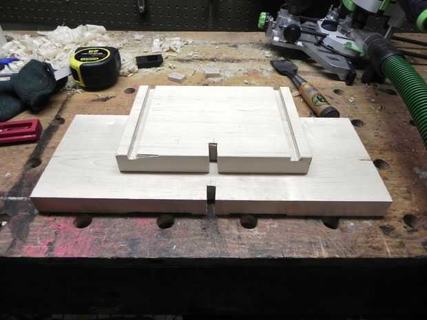 A continuación necesitamos una manera de aumentar la superficie de la mesa al centro del disco. Con la placa inferior en su lugar, me mide para arriba y vi que necesitaría unos 7" del espacio para llegar al centro. Perder 1" para una tapa de madera contrachapada, corte dos bloques de arce más en 6" de largo y Unidos a los lados en rebajos de poca profundidad.