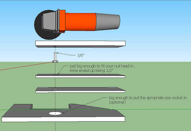 OK ahora encontrar un perno que encaja en el agujero de la manija de su amoladora angular, mina era un perno de 3/8" a 1 1/4" de largo y pienso que son bastante universales, si necesita quitar los soportes de hecho en el paso anterior para esto que puede hacer más fácil el agujero inferior es opcional, no lo pongo en pero podría ser conveniente , después de recibir todo lo que ponga en tomar 1 1/2" grabber tornillos y montar todo el asunto podría encenderlo y probar en este momento pero no lo recomiendo