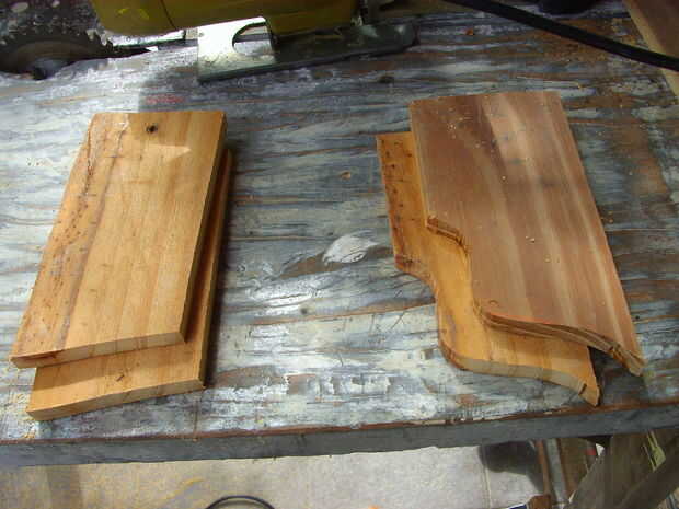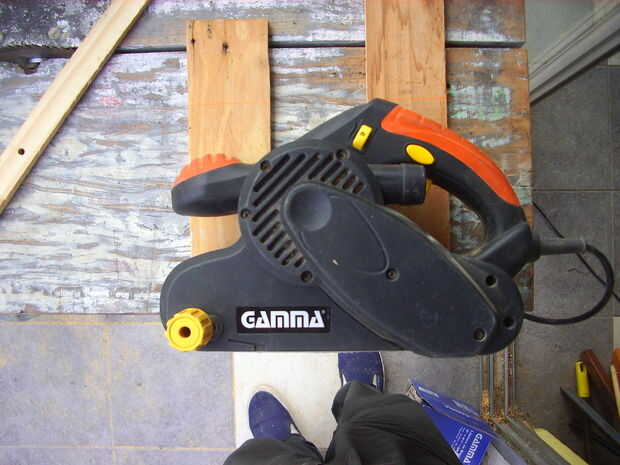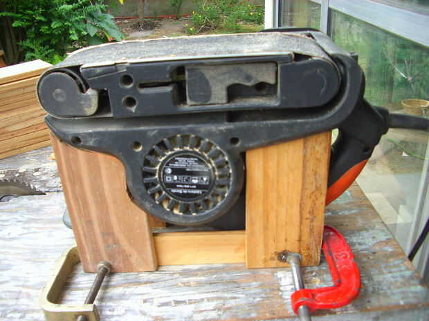 Empecé a poner la lijadora en su lado en la mesa, y hecha un lápiz marque en la madera sería un soporte lateral. Después de verificar que los titulares de un lado podrían ser idénticos a los de la otra, decidí empezar a cortar y pegar, siempre usando la estrategia WWP (trabajando sin planes). Desempolvado mi viejo B & D jigsaw (30 años de uso!) y unos cortes necesarios. Con pegamento blanco armé básico lateral partes. La cosa tomó forma rápidamente.