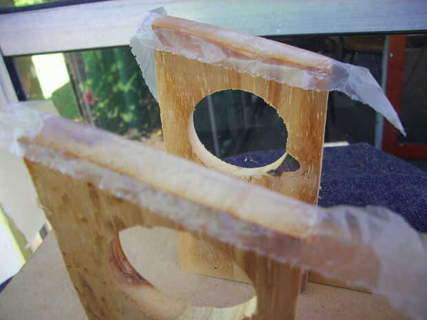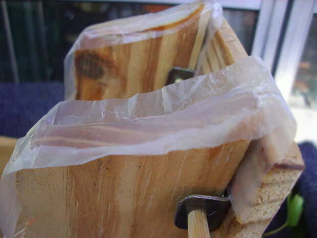 En lugares donde los apoyos tocan la lijadora apliqué una capa de 5 mm de sellador de silicona. Tiene dos propósitos: ocultar las irregularidades en el apoyo y protec de arañazos de la carcasa de plástico de la lijadora. Para la silicona suave, la cubrí con las tiras de polietileno que se quitará cuando se seca. Con una aguja que hice muchos agujeros pequeños en el polietileno, para permitir el secado