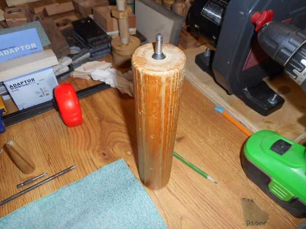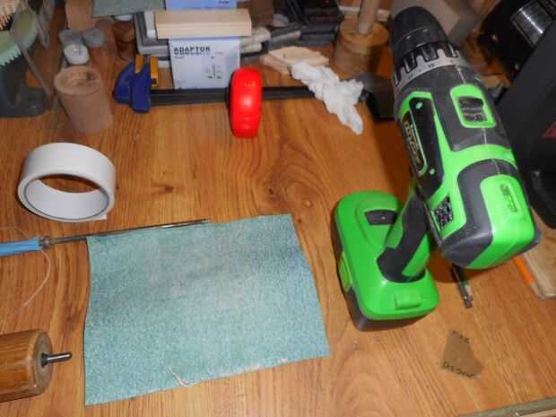 El rodillo fue utilizado para el tambor de lijar. Cinta de doble cara se utilizó para mantener bajo el papel de lija y un taladro inalámbrico todo hecho trabajo. Tomar los mangos el perno de balanceo y encontrar una viejo sordo broca que quepa en el agujero en el lado del perno de balanceo.