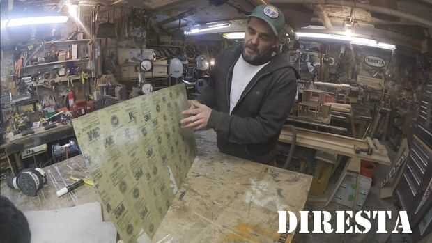 Spray pegamento de hojas de lija en el panel de vidrio. Con el tiempo el pegamento de aerosol podría perder su control y para evitar rasgar el papel de lija sugerimos para mantener las piezas de trabajo a un ángulo de 45° en las uniones del papel de lija.