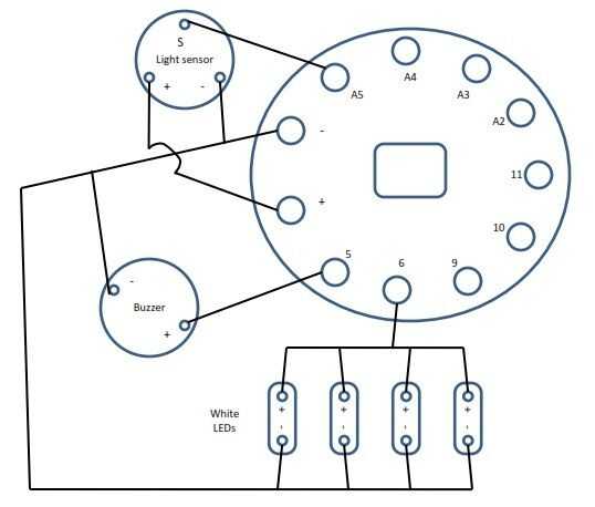 1. plan de tus circuitos. Es el dibujo del circuito que he creado para mi proyecto. Líneas separadas [es decir, el hilo] no pueden tocar! Si esto ocurre, el proyecto no funcionará. En el diagrama aparece el cruce de dos líneas — cuando cosía, tela fue aislar los hilos entre sí.