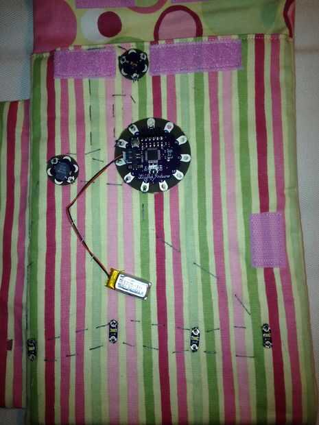 6. al sensor! Esta es la más delicada. He puesto el sensor entre mis piezas de velcro con el perno de S en la posición de 11:00. Entonces conecté el pin positivo a la patilla positiva en el tablero principal, mis puntos de esta línea fueron a la izquierda del sensor hacia abajo y cruzar el hilo actual [de lo negativo del zumbador a la negativa de la Junta] por ir en este hilo. De esta manera, la tela fue intercalada entre las dos líneas. Después de pasar por debajo de ese hilo, que conectado a la patilla positiva en el zumbador. Utilizando este mismo método para el cruce de líneas, entonces había conectado el pin negativo en el sensor a la patilla negativa en el tablero principal. Finalmente, conectado el perno de S en el sensor al pin de A5 en el tablero principal [nuevamente usando el excedente/bajo para el cruce de los hilos de rosca cuando sea necesario].