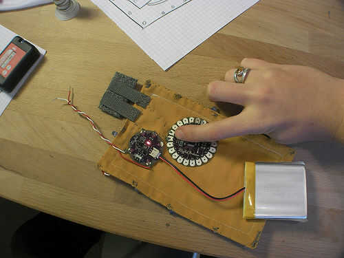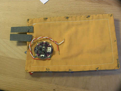 Coser junto a la lengüeta de velcro otras conductoras (pero no tocar) la ficha previamente cosida puntada una línea a la + en el LilyPad Arduino. Reforzado con estos dos cables un par de veces para reducir la resistencia de esta zona conmutable.