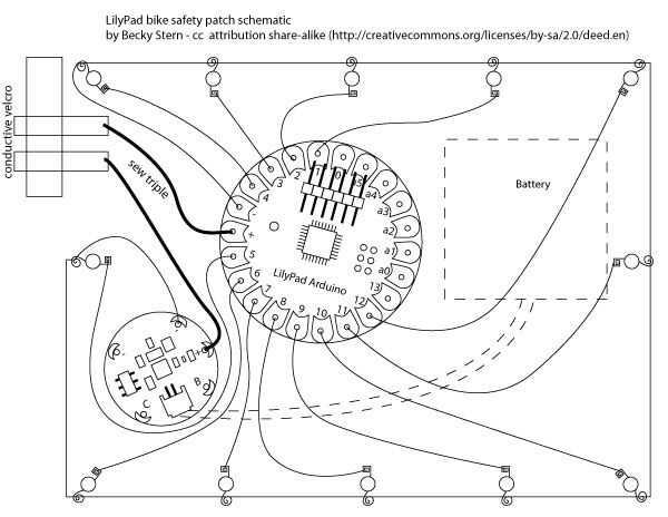 La tierra de la fuente de alimentación a la línea de terreno alrededor del borde de la puntada. Lo mismo va para el LilyPad Arduino. Mira este esquema ayuda a poner las huellas.