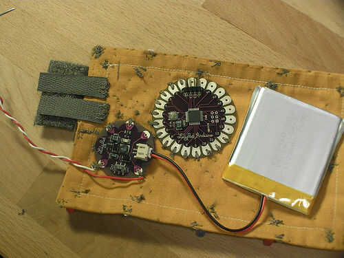 En este punto puede Conecte la batería en el LiPower y encender la cosa. Utilice el otro trozo de velcro conductor puente las fichas de dos parches y ver si su LilyPad botas para arriba. Pulse el botón reset un par de veces y ver que poco verde condujo a bordo de abrir y cerrar un poco. Ahora lo que está trabajando!