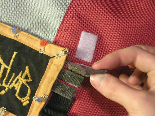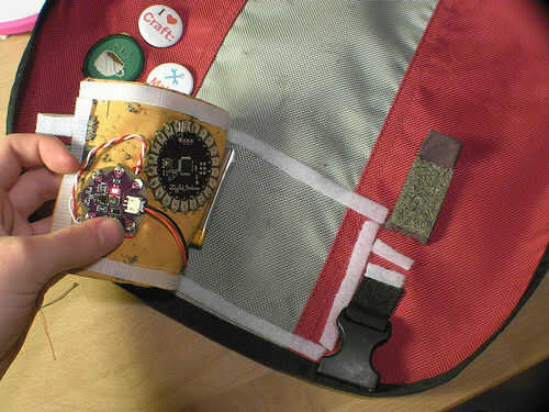decidí pegar el parche todo circuito con velcro en lugar de coser hacia abajo hasta mi bolso, con aire de viajes en mente específicamente. Es fácil de retirar, inspeccionar y reemplazar. Yo vivo en Arizona, por lo que la lluvia no es demasiado preocupante, pero también deben eliminarse durante la lluvia. Usted puede elegir simplemente retirar la batería, como el resto del circuito no dañado por el agua, mientras espera a estar completamente seco antes de enchufar la batería a.