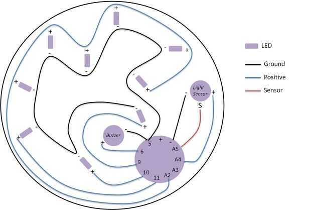- Plan de la costura. Sus puntadas con el hilo conductor se realizará a través de la capa posterior de la tela solamente (con la excepción de puntadas que contienen componentes electrónicos en su lugar al frente de su proyecto). No olvide cruzar puntos de sutura. Mi guía de puntadas se muestra en la foto de arriba.