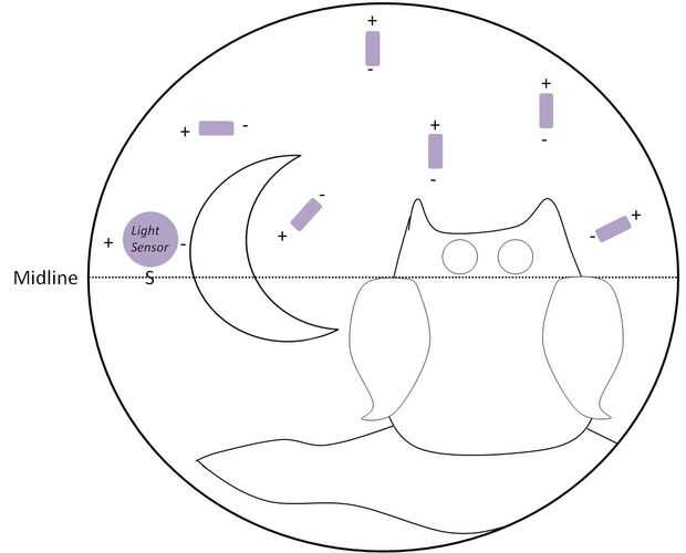 la parte inferior del panel día.- Sketch los paneles del día y la noche. Incluye localizaciones para todos los componentes electrónicos. El sensor debe colocarse en la parte frontal del panel de la noche, por encima de la línea media. Ver las fotos de mis dibujos.