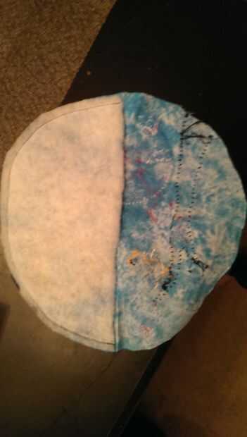 - Lugar la noche círculo derecho hacia arriba sobre una superficie plana. Luego coloque el lado derecho día círculo hacia abajo en la parte superior del círculo de la noche (lados del derecho juntos), con la parte inferior del círculo día reunión la parte superior del círculo de la noche. En otras palabras, los dos paneles deben ser derecho lados juntos, pero boca abajo unos de otros. Finalmente, ponen su medio círculo de paño grueso y suave fusible sobre la mitad superior del panel del día (la mitad con el sol). Prender alrededor de los bordes para mantener todo en su lugar, y luego coser el borde exterior de la mitad de la lana, dejando un margen de costura de 1/4". No coser la otra mitad. Gire a la derecha hacia fuera y al fusionar las tres capas.