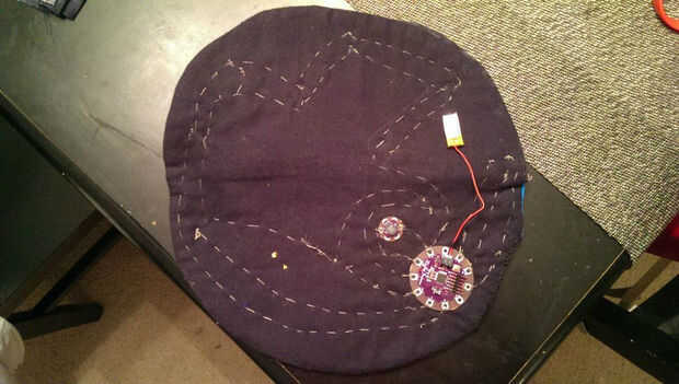 - Coloque el timbre a la parte superior izquierda de la placa LilyPad (+ a la izquierda). Con el hilo conductor, realizar varias pasadas por el pin positivo del zumbador, asegurándose de que sólo pasan a través de la tela de forro (no quieres tus puntadas para demostrar para arriba en el frente de su proyecto). Luego hacer una línea de costura limpia al Pin 6 de la placa LilyPad y hacer varias pasadas a través de ese pin, va otra vez solamente a través de la tela de forro. Hacer lo mismo desde el pin negativo del zumbador a 5 Pin del LilyPad.